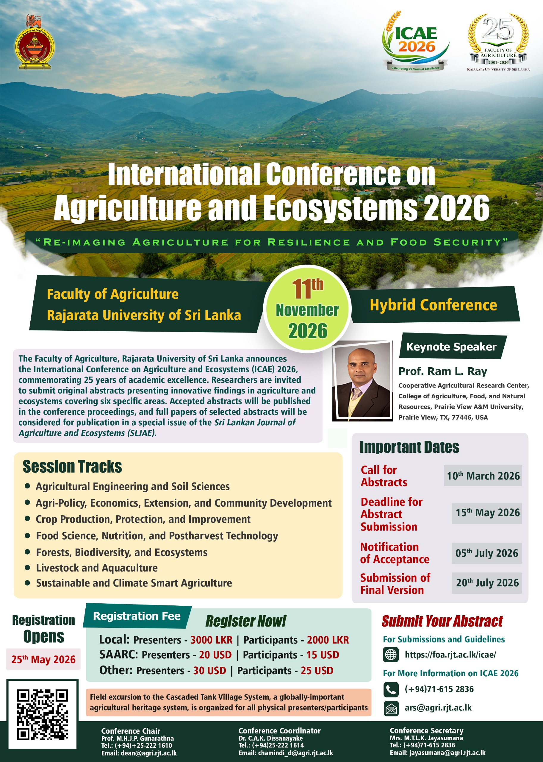 In celebration of 25 remarkable years of academic excellence and scientific achievements, the Faculty of Agriculture, Rajarata University of Sri Lanka, proudly presents its International Research Symposium 2026, a milestone gathering that promises to be as inspiring as the legacy it holds. On 10th and 11th of November 2026, the symposia intend to bring together distinguished researchers, visionary scholars and passionate practitioners to share their pioneering ideas under the theme of agriculture, to unravel their inspiring ideas that can sow seeds for tomorrow’s breakthroughs.  The symposia will be graced by two prominent and international keynote addresses along with presentations which can ignite thought provoking conversations and inspire the next generation of agricultural scientists. Come, be part of history, as we honour the curiosity, resilience and relentless pursuit of knowledge that has defined this faculty for quarter of a century and together cultivate a brighter, greener and sustainable future in the field of Agricultural sciences.